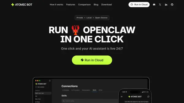 Atomic Bot transforms the powerful OpenClaw framework into an accessible personal AI assistant designed for everyday users. The platform eliminates the technical barriers typically associated with AI assistants by offering a simple one-click installation process and guided setup, making advanced automation capabilities available to users without terminal or coding experience. Users can run Atomic Bot either locally on their device or in an encrypted cloud environment, maintaining full control over their data and privacy preferences. The assistant integrates with over 100 applications and offers 700+ personalized skills that can be customized to match individual workflows. From managing Gmail threads and scheduling calendar events to summarizing documents, organizing files, and automating browser tasks, Atomic Bot operates as a 24/7 coworker that learns user preferences over time through persistent memory. The platform supports multiple AI models including Claude, GPT, and Gemini, allowing users to switch between engines based on their specific needs while maintaining the same intuitive chat-based interface.