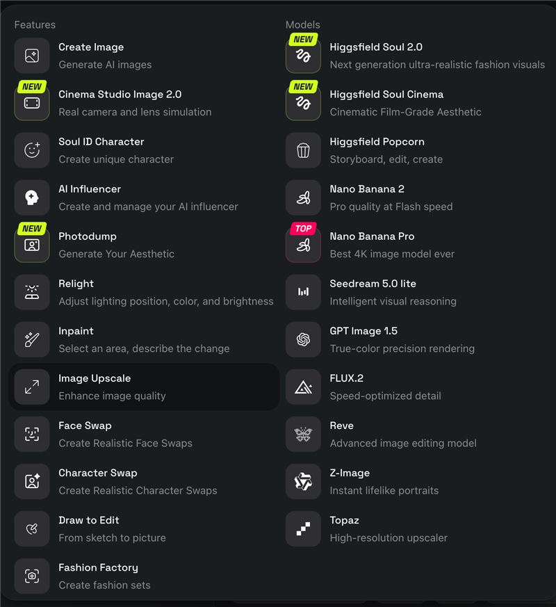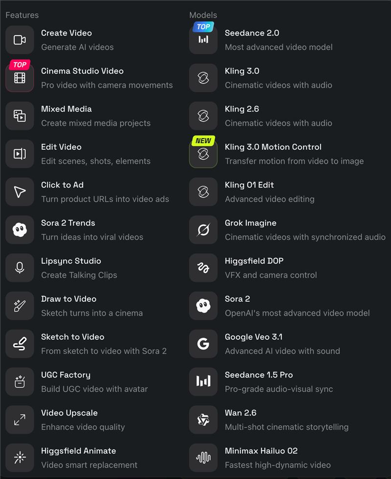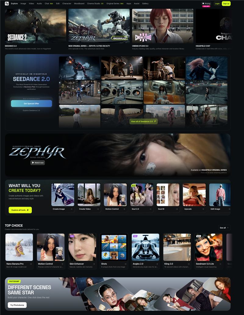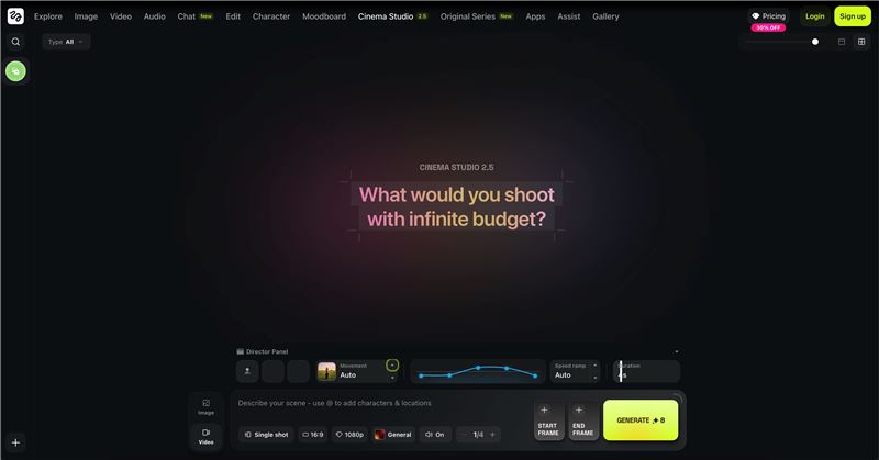 The platform's cinematic reasoning engine automatically determines narrative arc, camera motion, pacing, and model selection, so users describe their vision and the system directs the shoot. Proprietary models include Soul 2.0 (photorealistic fashion/editorial imagery), Higgsfield DOP (precise cinematic camera control), Soul ID (character consistency across shots), and Soul Cinema (film-grade storyboarding). Cinema Studio 3.0, Higgsfield's flagship AI filmmaking suite, features a cinematic reasoning system that interprets story intent from up to 9 reference images and a text prompt. It generates synchronized audio (sound effects, speech, and music) natively alongside video, collapsing the entire post-production pipeline into a single pass. It ships with 7 genre modes (General, Action, Horror, Comedy, Noir, Drama, Epic), real optical physics simulation, virtual camera bodies, lenses, focal lengths, and color grading. Experienced filmmakers retain full manual control over camera, lens, and grading, while first-time users can direct at a high level and let the reasoning engine handle execution. The platform also orchestrates the best-performing image, audio and video models, including Google Veo, Kling, Nano Banana, Seedance, WAN, and Minimax, across a unified system of presets, templates, and workflows, removing the need for users to understand model-specific strengths and weaknesses.