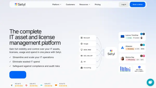 Setyl is a modern IT management solution purpose-built to streamline IT asset, license, and spend management across organizations of all sizes. The platform delivers complete oversight of hardware assets, software applications, license allocations, assigned users, vendors, and IT spend, supporting company-wide compliance with standards such as ISO 27001 and SOC 2. With its cloud-based architecture and integration capabilities, Setyl enables teams to consolidate IT inventory, automate onboarding and offboarding, manage vendor relationships, and monitor the full lifecycle of digital and physical assets from procurement to disposal.Setyl further enhances operational productivity by supporting automated workflows, actionable financial reporting, and powerful detection of shadow IT and unused licenses. Its intuitive interface and robust integrations with business tools like Microsoft 365, Google Workspace, HR systems, and ticketing desks facilitate collaboration while reducing manual effort and redundancy. By leveraging Setyl, organizations can optimize their IT spend, improve audit-readiness, and ensure efficient, secure technology management at scale.