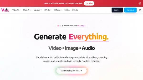 Vidofy.AI is a versatile AI generation platform that consolidates multiple flagship AI models into a single, user-friendly interface. The platform enables creators to generate cinematic videos, high-quality images, and realistic audio content without requiring technical expertise or design skills. Users can access industry-leading models including Kling AI, Runway, Midjourney, Flux AI, Stable Diffusion, and many others through one subscription.The platform supports a wide range of creative capabilities including text-to-video conversion, image-to-video animation, video style transformation, text-to-image generation, lip sync video creation, and voice cloning. With over 400 viral effects and multiple AI-powered editing tools, Vidofy.AI serves content creators, marketers, designers, and businesses looking to accelerate their visual content production. The platform offers both free and paid tiers, with commercial usage rights available for paid subscribers.